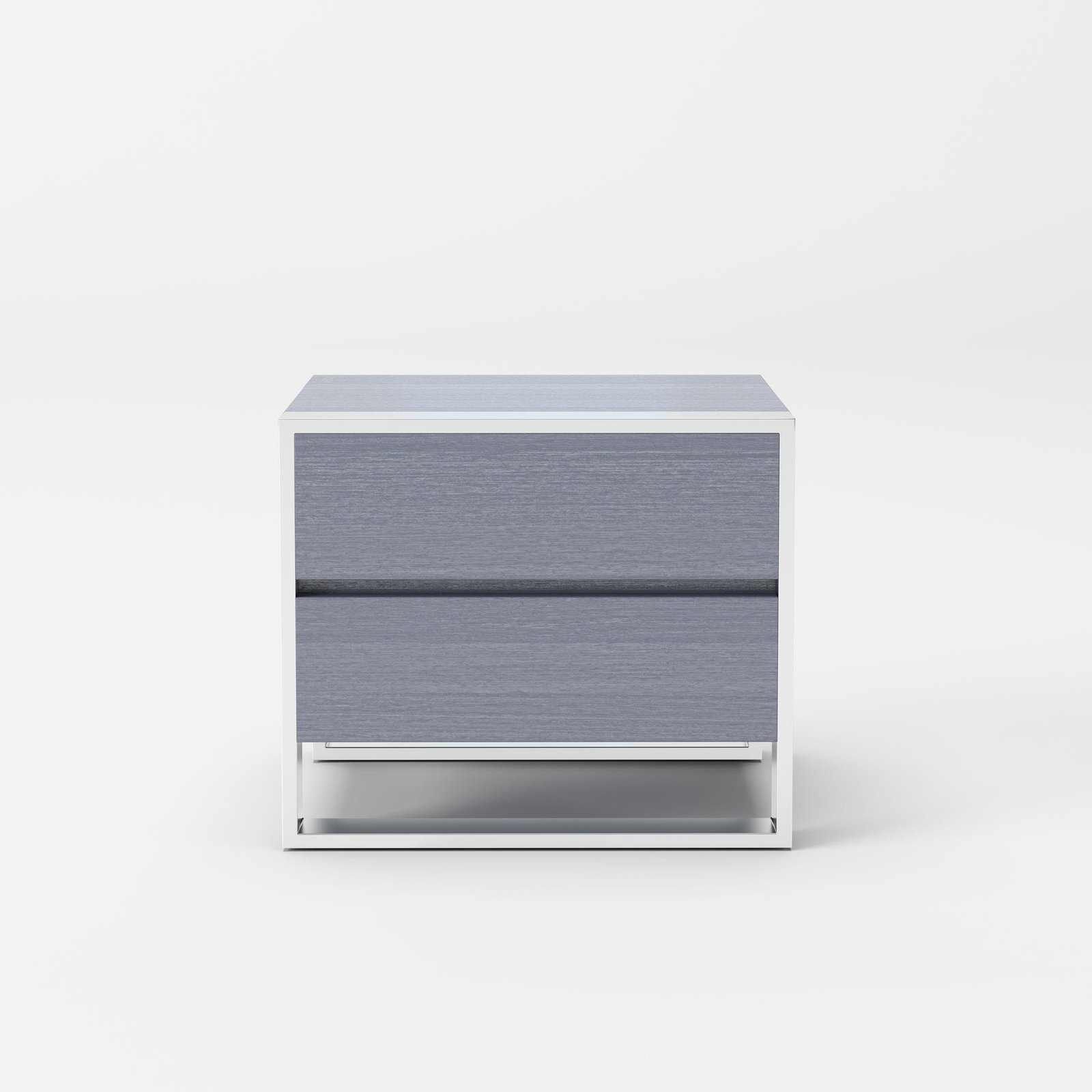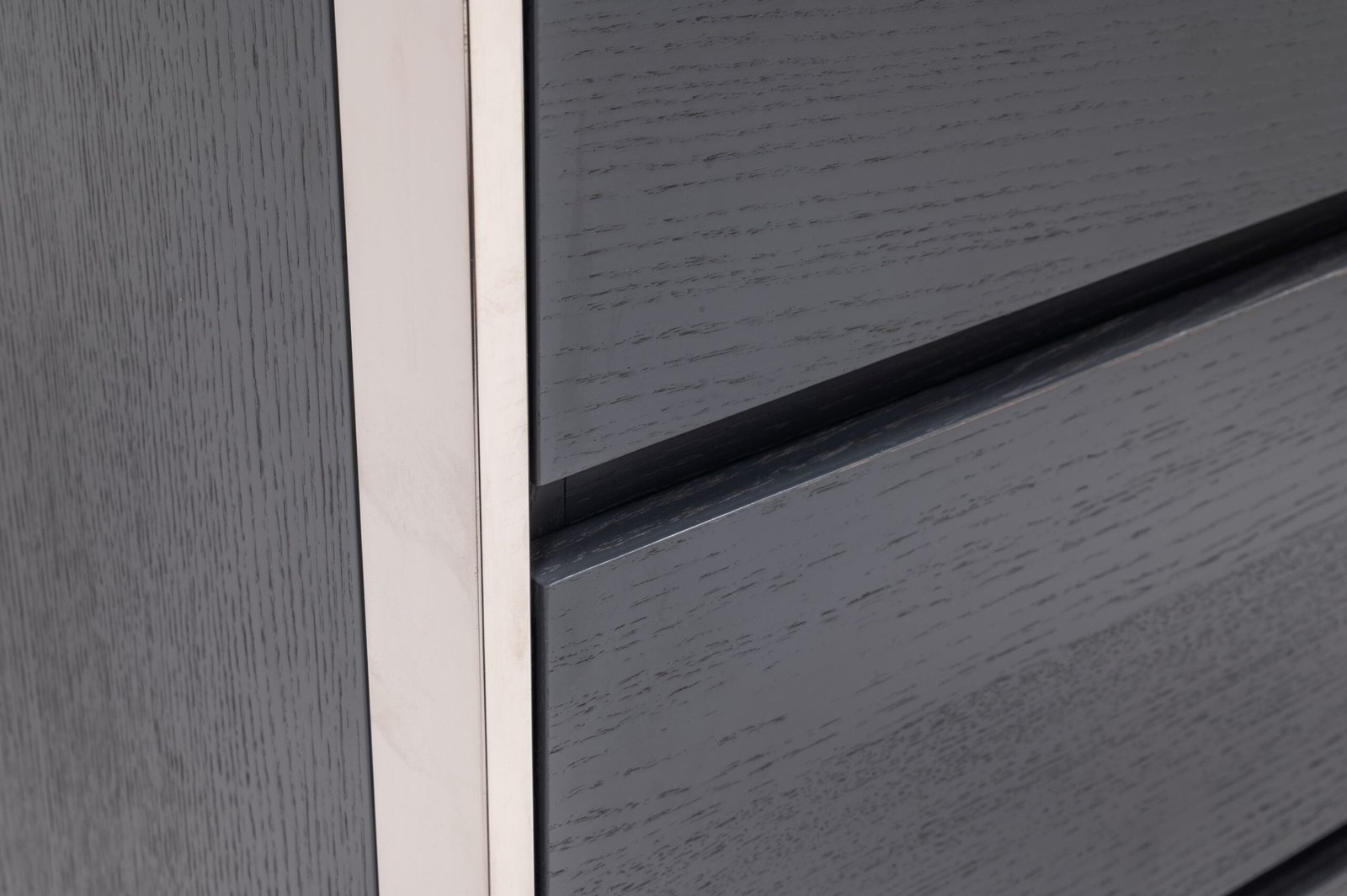 chapa de roble gris de los dos cajones es lisa y moderna. Rodeando el frente