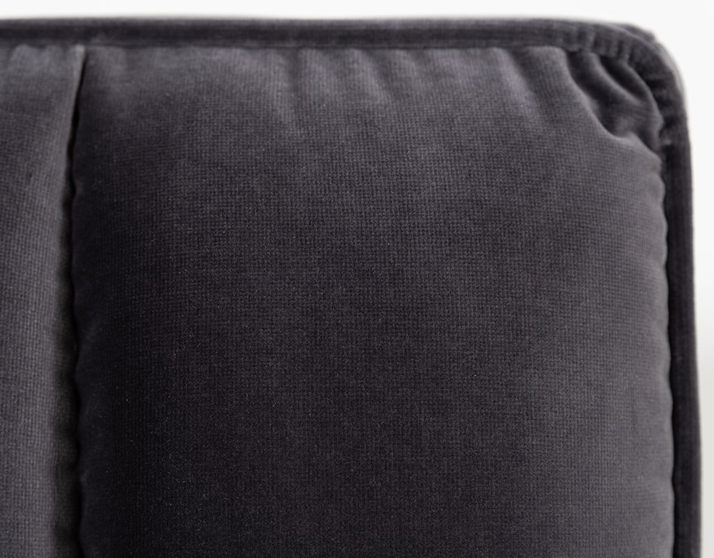 plisado en el frente, está tapizado en una relajante tela de terciopelo gris.